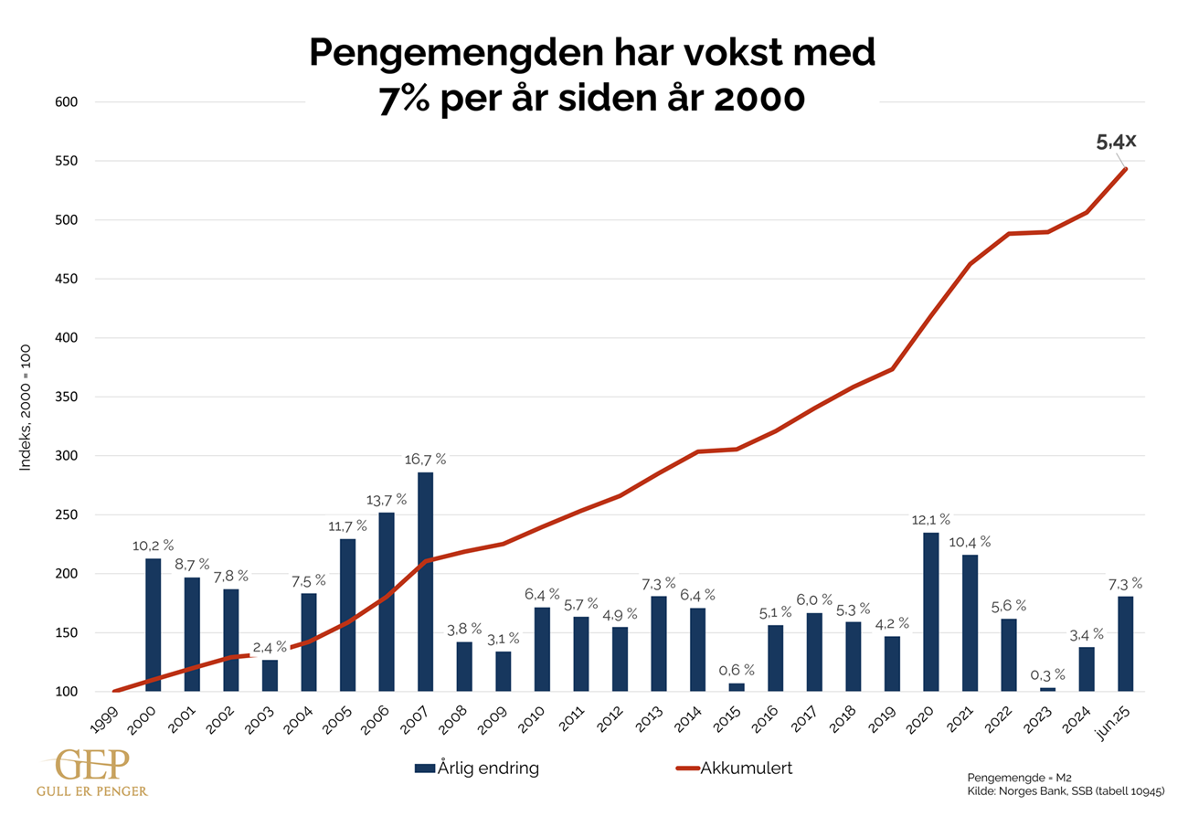 I løpet av en periode på i overkant av 100 år har prisen på en bolig, en grunnleggende menneskelig nødvendighet, steget ca. 600 ganger. Stater og sentralbanker, Norge inkludert, har satt en langsiktig trend for å svekke valutaene, guidet av en strategi om at inflasjon (forringelse av valutaen) er nødvendig for økonomisk vekst.