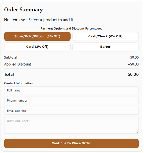 Gården har slagordet «Honest money for honest products» og er stolte av å akseptere edle metaller som en del av sin filosofi om ærlige verdier. Dette gjør det mulig å handle uten å være bundet til bare fiat-valuta.