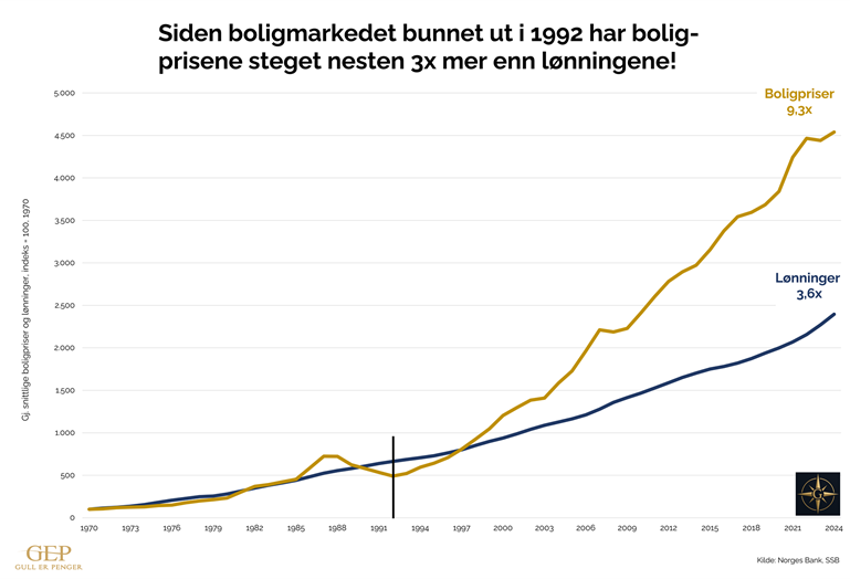 Etter at boligprisene bunnet ut i 1992 (markert ved strek i grafen) har boligprisene har steget cirka 9,3 ganger, mens lønningene kun har steget 3,6 ganger. Boligprisene har med andre ord steget 2,6 ganger fortere enn lønningene, og det på bare litt over 30 år.