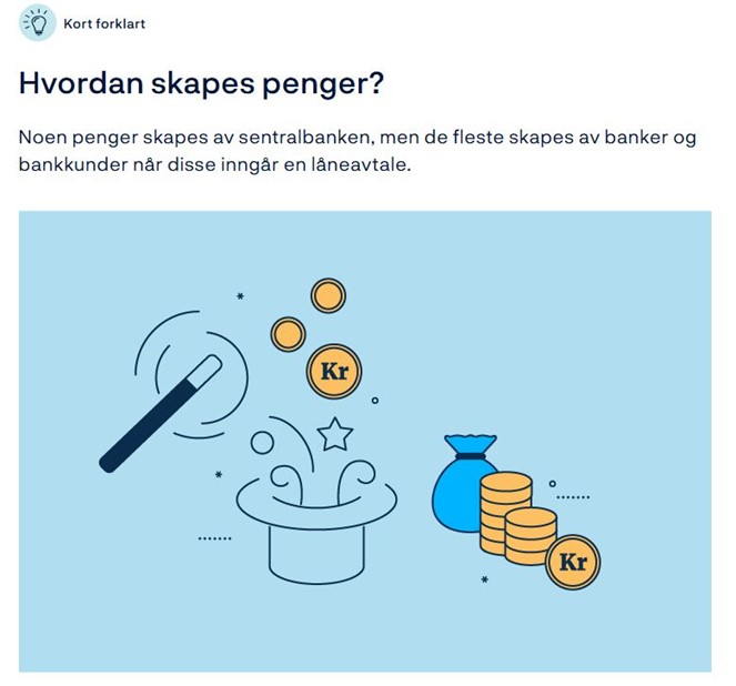 For eksempel: Hvis du låner 1 million kroner, øker banken saldoen på kontoen din med 1 million, og samtidig skriver de opp at du skylder dem 1 million. Pengene er skapt "ut av ingenting"!